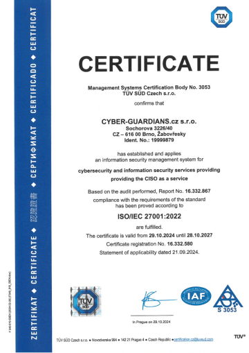 In the field of information and cyber security, we go beyond words. To demonstrate our expertise and reliability not only to ourselves but especially to our customers, we have implemented an Information Security Management System (ISMS) in accordance with the requirements of the international standard ISO/IEC 27001:2023. This system applies particularly to our services in cyber security and the provision of cybersecurity management services.