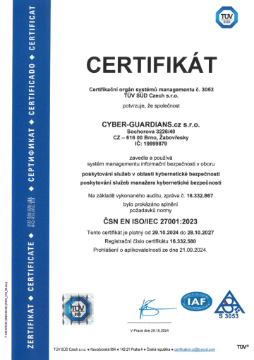 V říjnu 2024 jsme úspěšně prošli první certifikací a nyní se můžeme pochlubit certifikátem, který potvrzuje naši profesionalitu a závazek k bezpečnosti. Svým zákazníkům tak nabízíme jistotu, že s jejich informacemi nakládáme dle nejvyšších standardů a jsme pro ně spolehlivým dodavatelem kyberbezpečnostních služeb.
